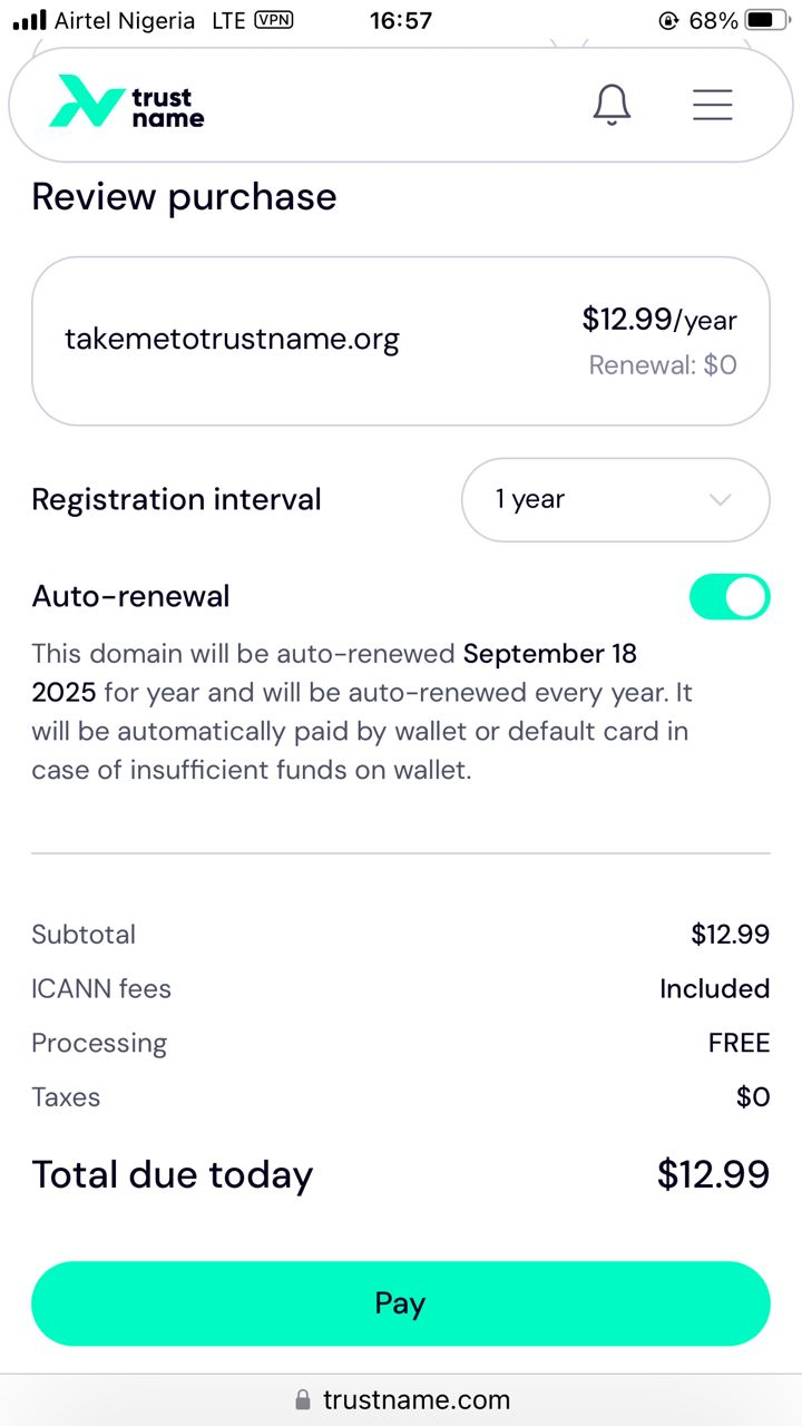 Click 'Pay' and follow the prompts to finalise your transfer. Your domain will then be on its way from Domain.com to Trustname.