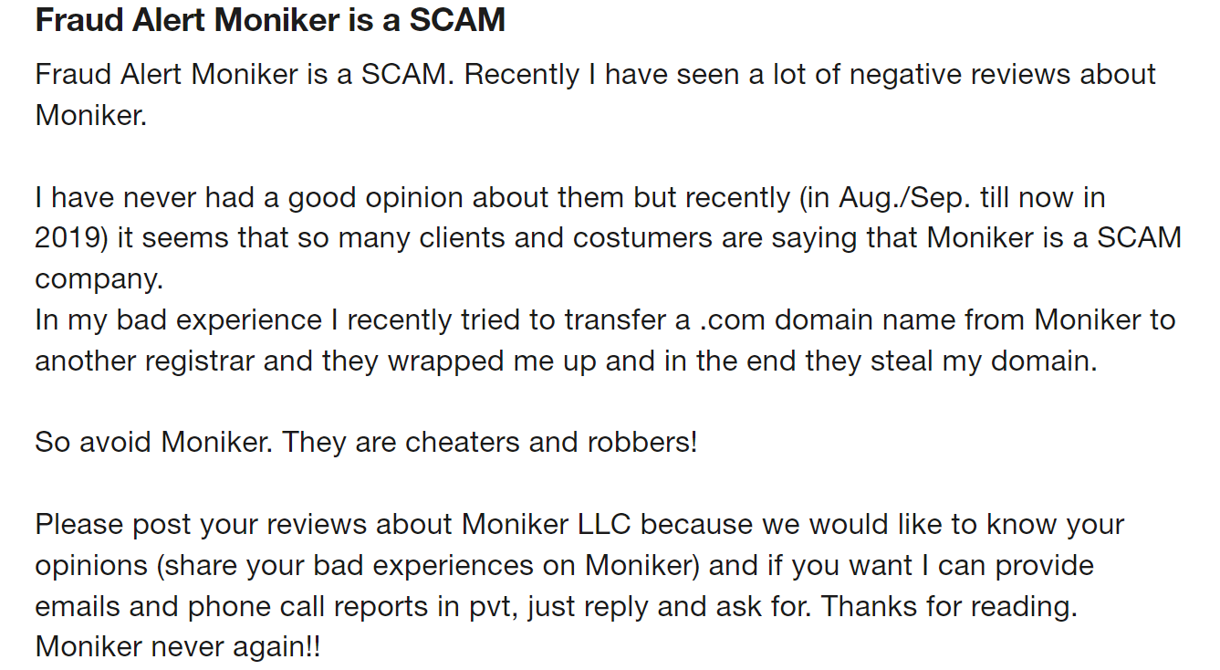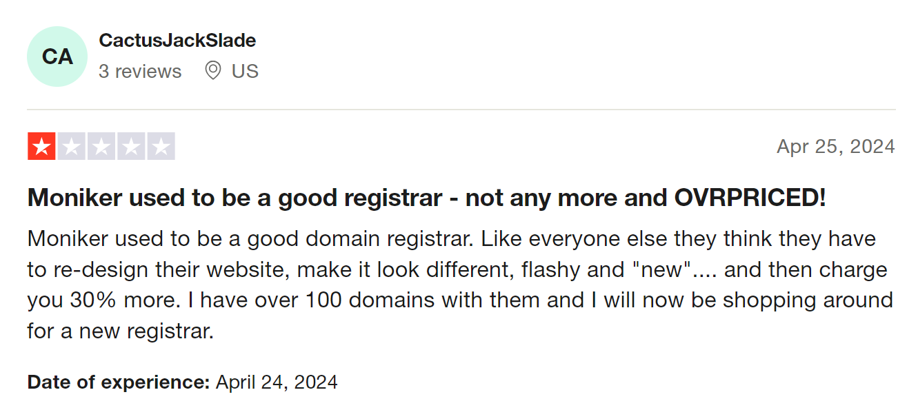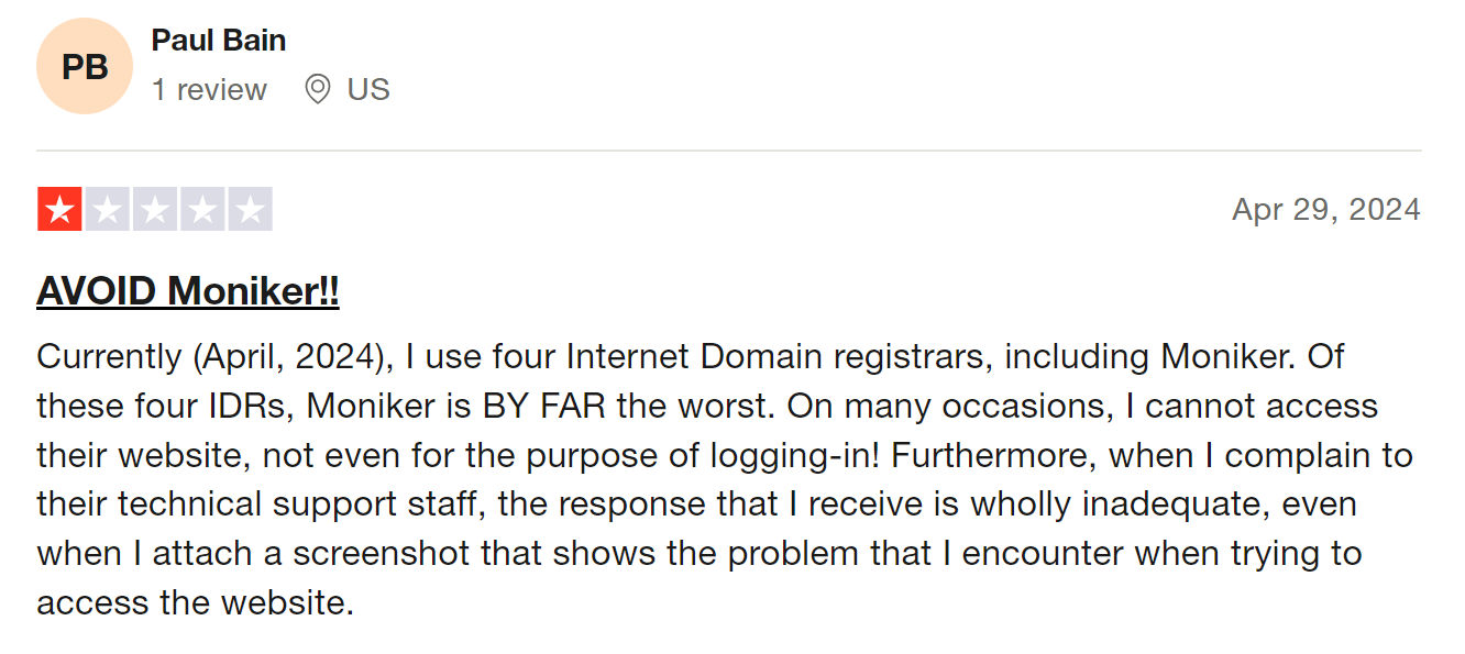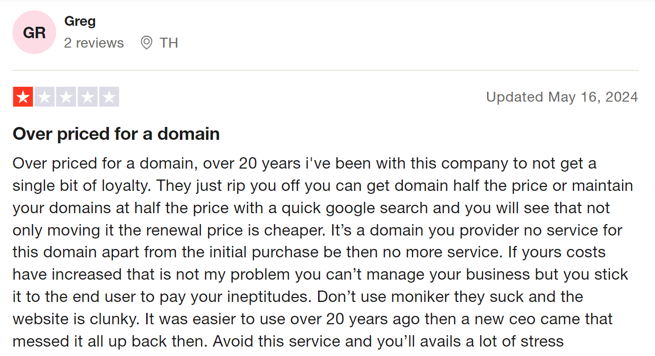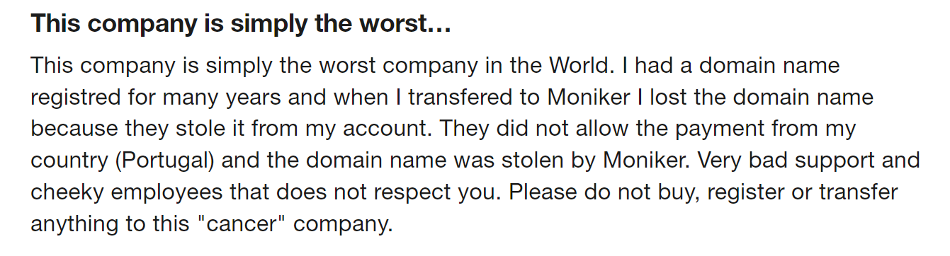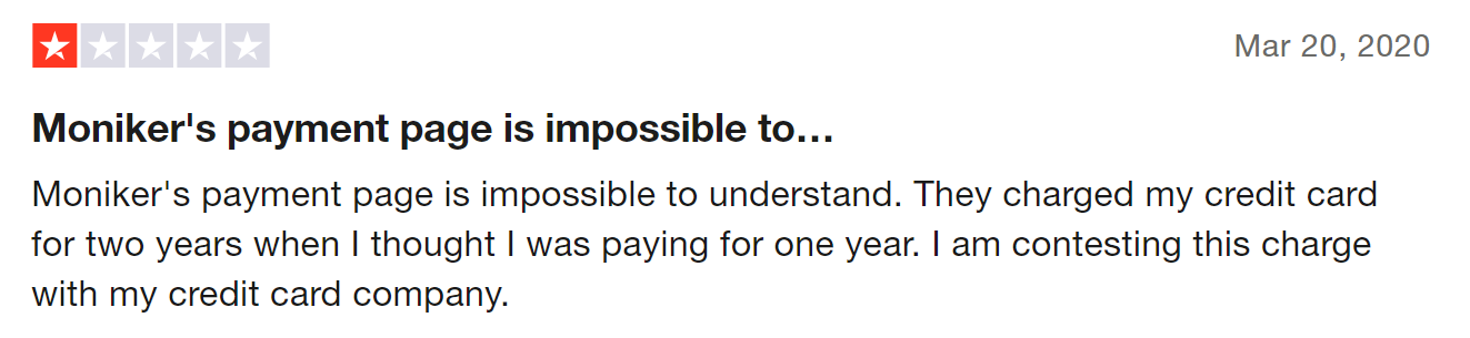 Moniker customers also complain about how shady the registrar's payment systems can be. From unexpected charges to refusing payments for domains that are about to expire and putting their domains at risk of being lost, if you do not want to take any chances, you're better off with Trustname.