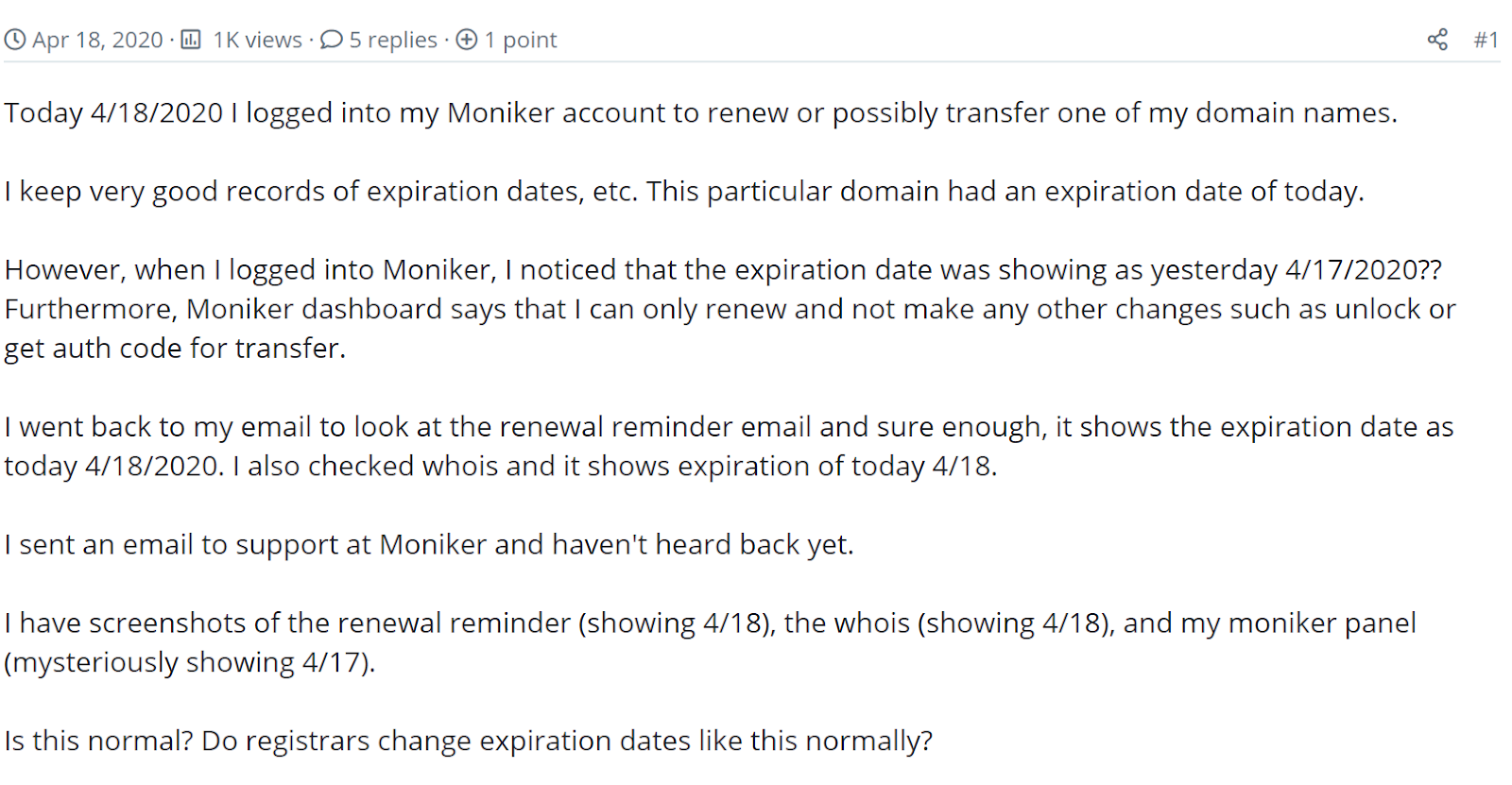 We won't point fingers too much, but Moniker customers also complain about how their domains are suddenly removed from their accounts early on in the Grace Period or when transfers are initiated.