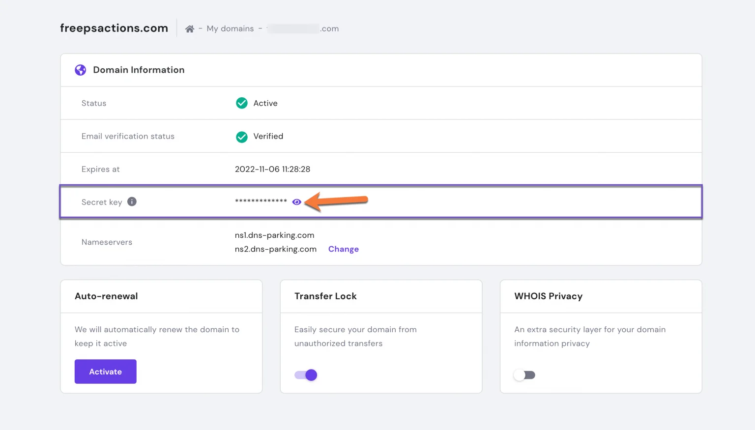 - Preparation – Disable the domain lock and Whois privacy, and copy the secret key.