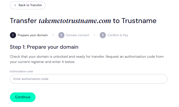 - Enter the Auth Code (EPP code) you copied from UlatHost and click on 'Continue'.