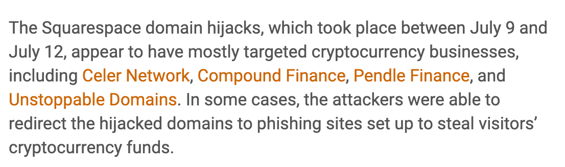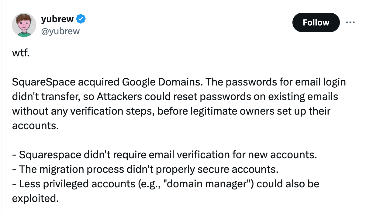 When Google sold off to Squarespace, several websites (domain names) got hijacked the following week. This is because the transferred domain owners had yet to set up a new account with Squarespace, and hackers saw this as an opportunity to steal the domain(s).