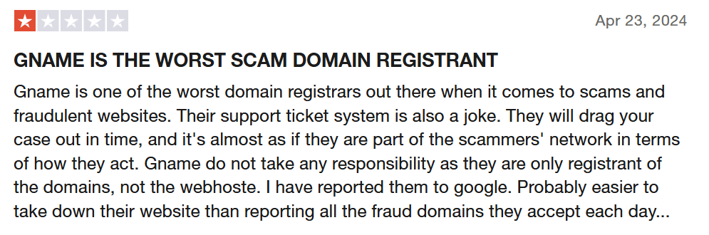 The general reviews of Gname on Trustpilot show that their customers are overwhelmingly unsatisfied.