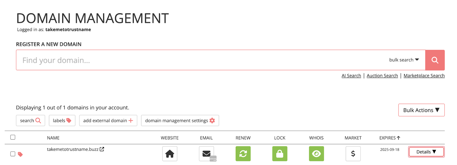 - Click the inverted triangle button tagged 'Details' next to your domain name.