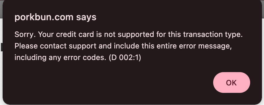 We tried to get a domain from Porkbun but were rejected twice because our payment method wasn't 'Supported'.