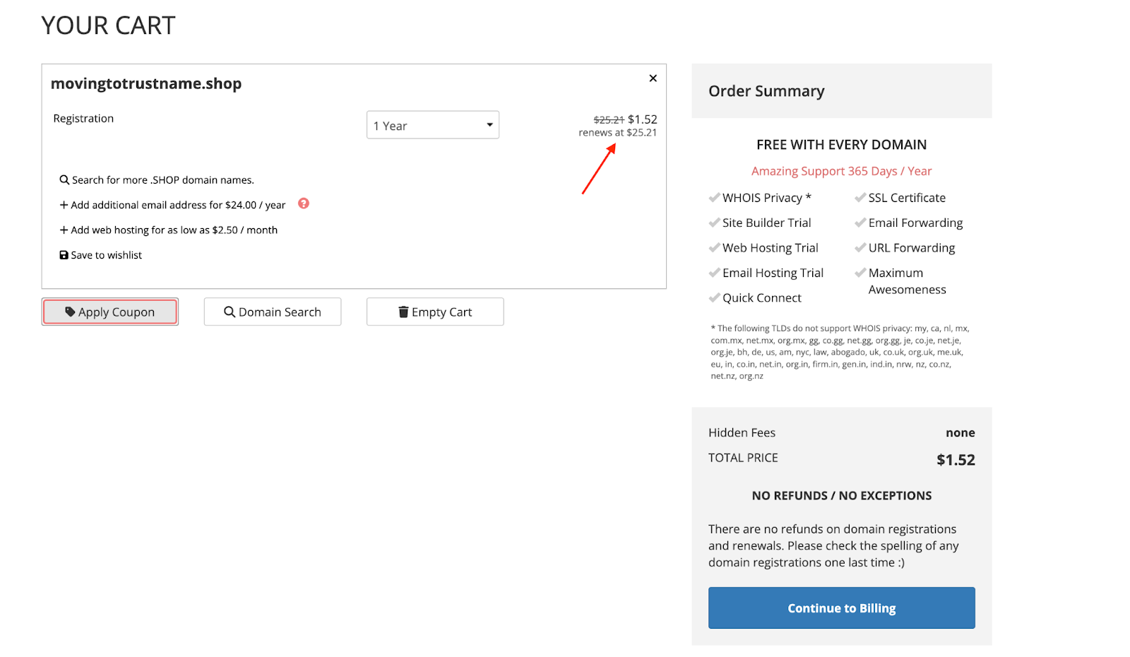 In this final step, pay for your domain and get an extra year automatically added to the current expiry date.