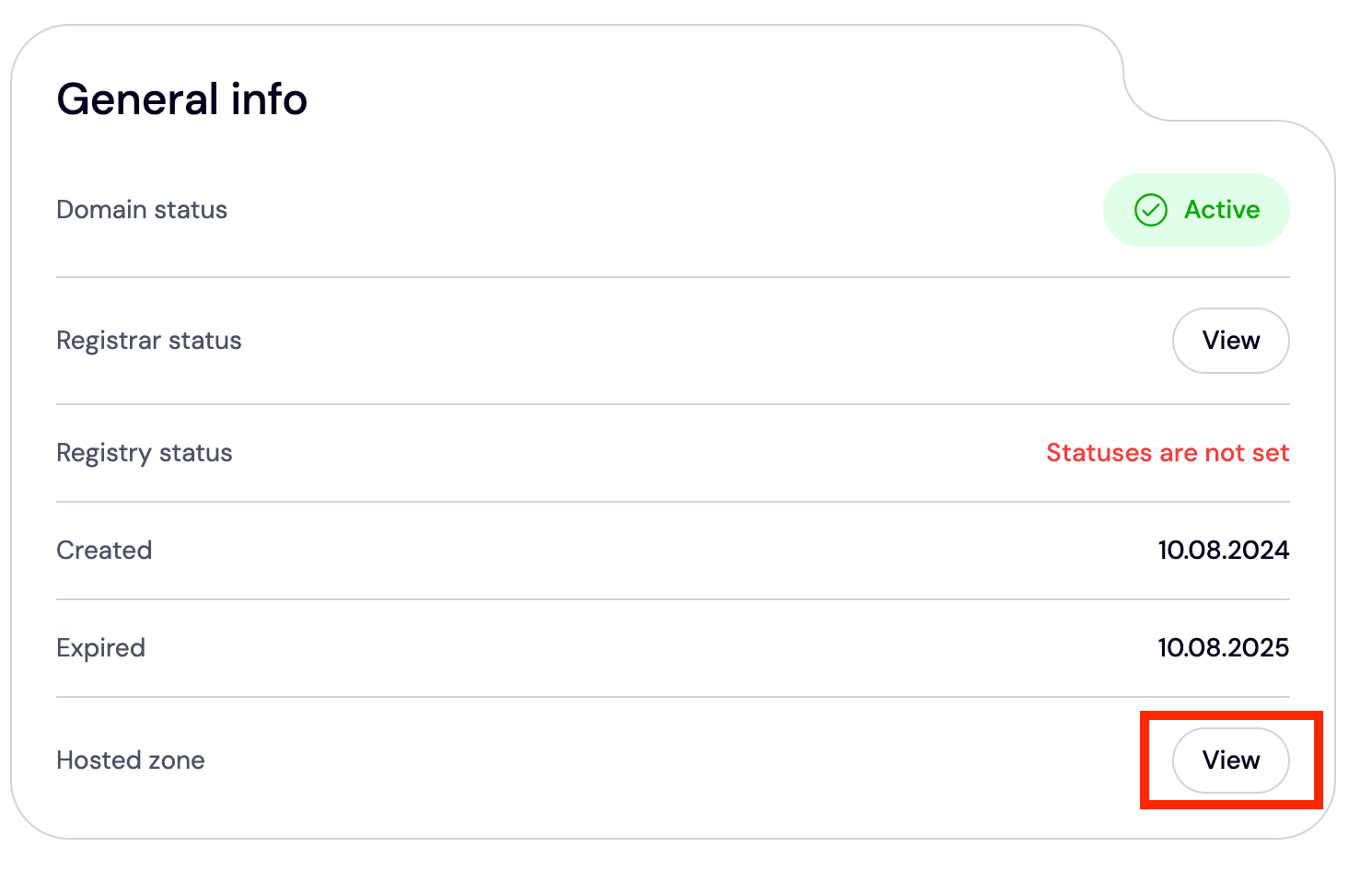 To check your DNS record, navigate to 'General Info' at the top of the page. Here, search for 'Hosted Zone' and click 'View'.