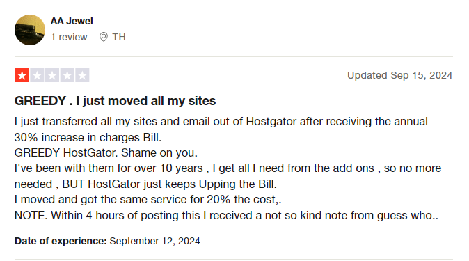 Customers on HostGator complain about the ridiculous renewal costs and policies. When you purchase a .com domain at $12.99, your next renewal jumps to $22.99. To make matters worse, there's a 30% yearly increment on renewals, which will punch a hole in your pockets in the long run.