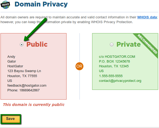 Log into your HostGator domain management portal and go to the Domains tab. Click on the 'Domain' name in question, hover your mouse over the icons on the left, then click 'Domain Privacy' On the Domain Privacy page, select the Public button to disable Domain Privacy, and click 'Save'.